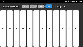 Aplikasi Βυζαντινό πιάνο adalah alat pendidikan yang dirancang untuk pengguna Android. Dengan antarmuka yang sederhana, aplikasi ini memungkinkan pengguna untuk memilih dari empat jenis skala, yaitu diatonik, skala kromatik lembut, skala kromatik keras, dan skala enharmonik. Setiap skala menawarkan pengalaman yang berbeda dalam bermain piano, serta meningkatkan pemahaman musik pengguna.